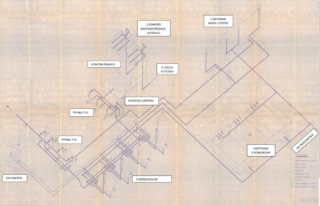 Scan. Schemat układu technologicznego SUW Trzcianka. (ok.1972r.).